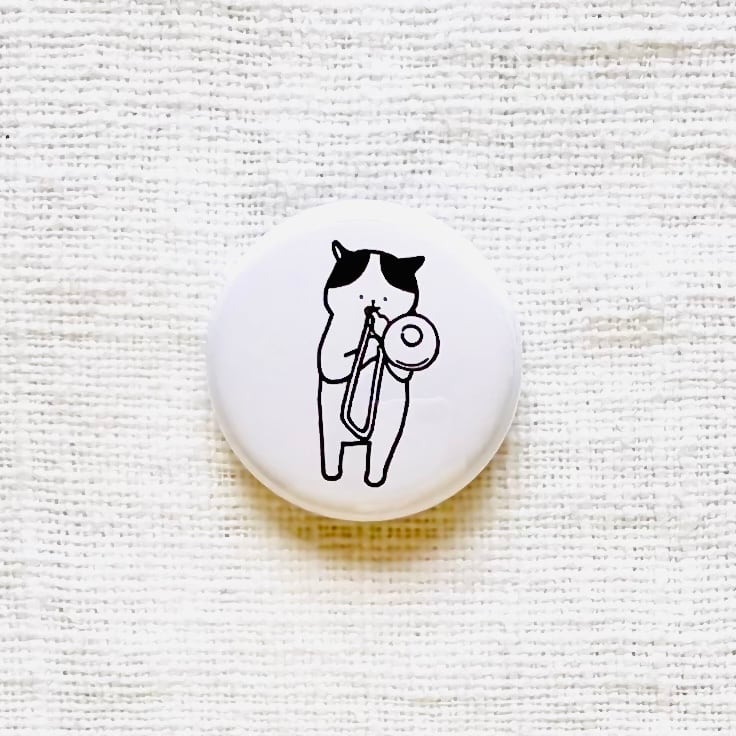 トランペットやトロンボーンなどを演奏するねこのバッヂです。